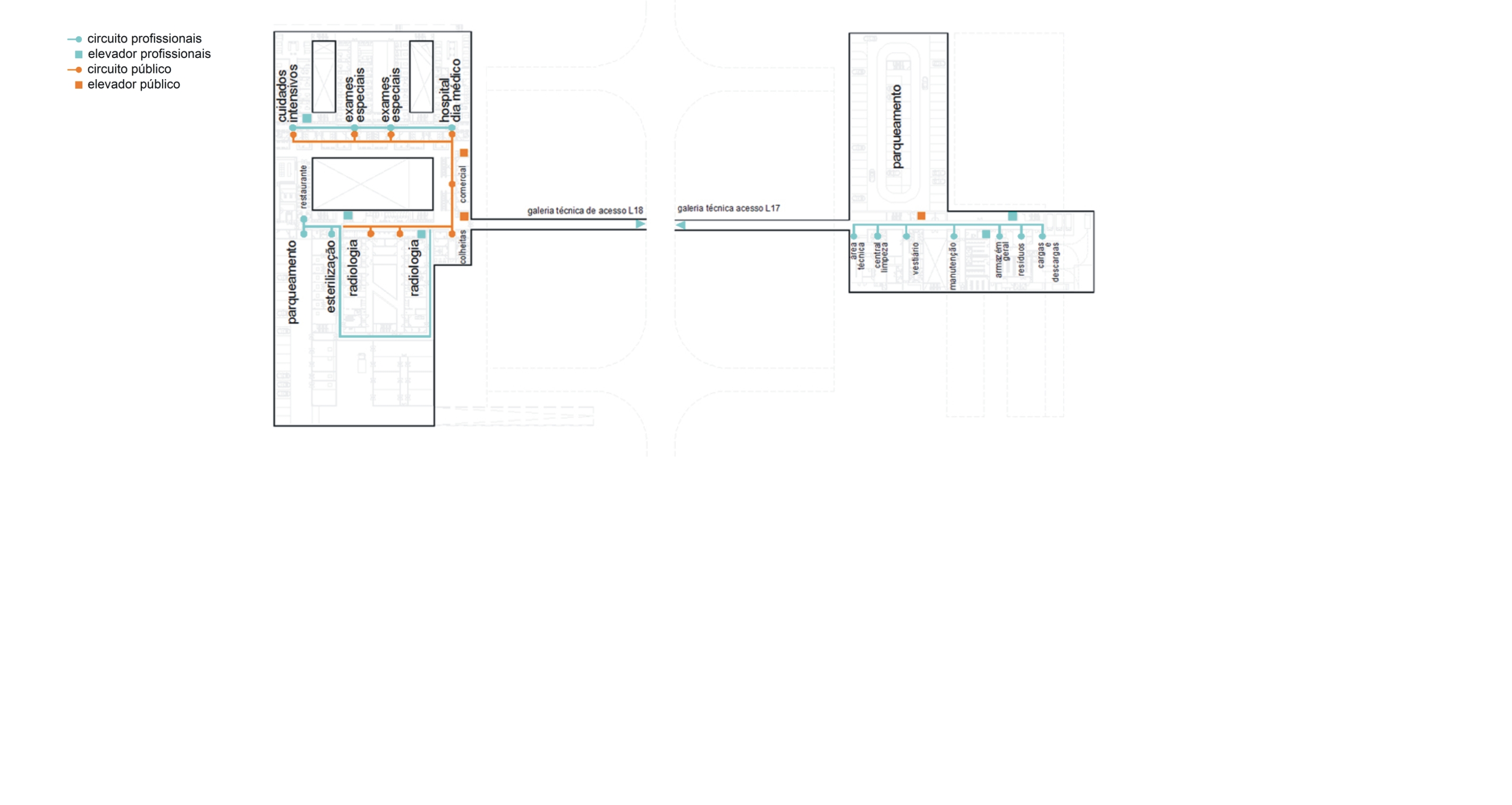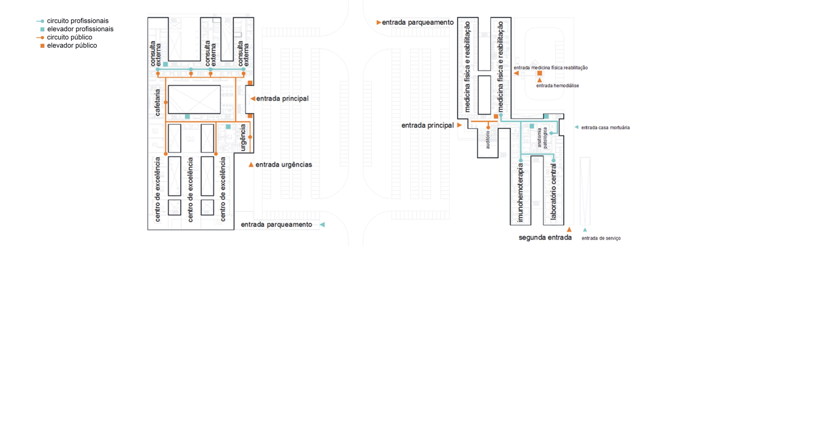 O propósito primeiro da Arquitectura de grande escala, é o financeiro. A resposta projectual a essa intenção é a sistematização. A sistematização de recursos e de elementos. Foi estabelecido um módulo espacial/construtivo, com 3,90x2,85m, que corresponde à melhor optimização combinada do módulo do Gabinete de Consulta e do Quarto de Internamente, e que foi, sem excepção, aplicado a todo o complexo. Sobre esta rigidez imposta pela malha, a estratégia de distribuição das Áreas/Espaços Funcionais pelos Lotes 17 e 18 passou pela concentração máxima, num só edifício, de todas as áreas cuja interligação se considera obrigatória à boa prática hospitalar, e à garantia da normal actividade do dia-a-dia hospitalar.