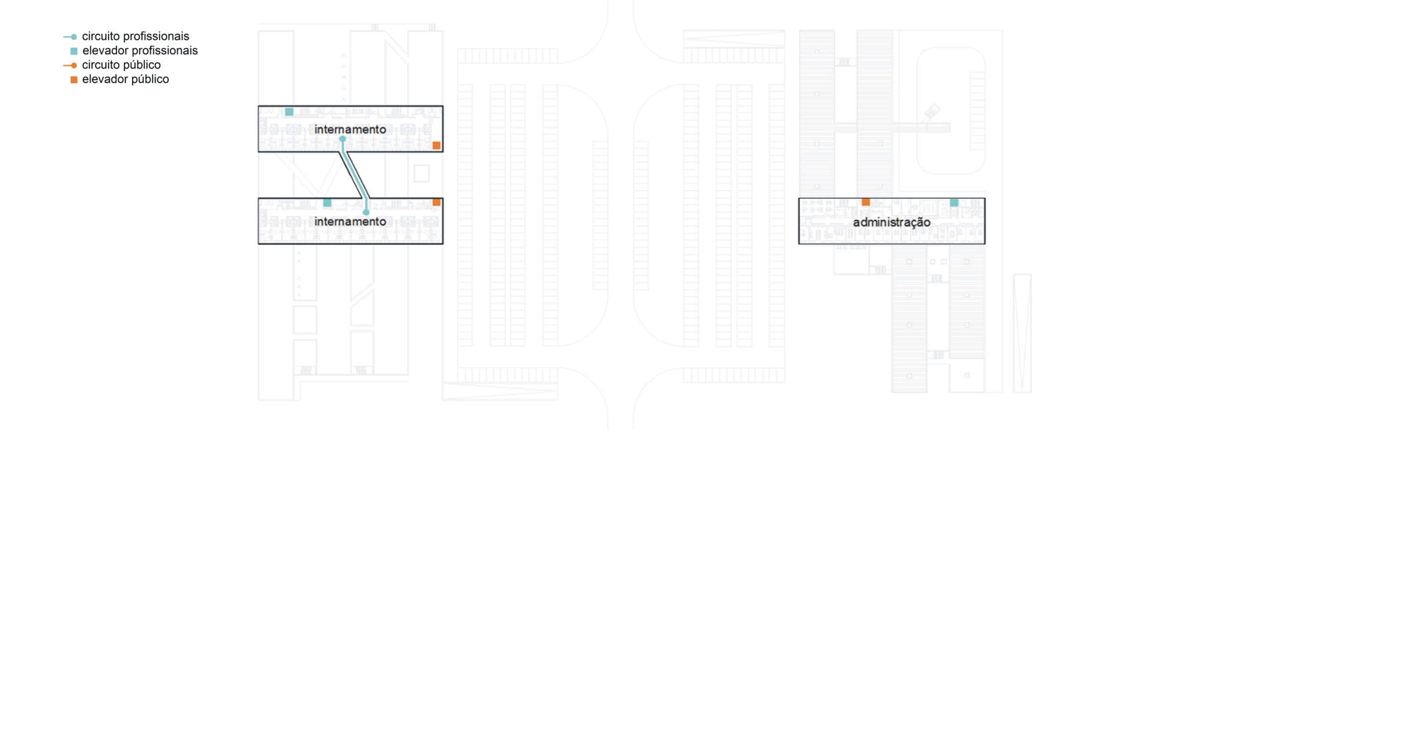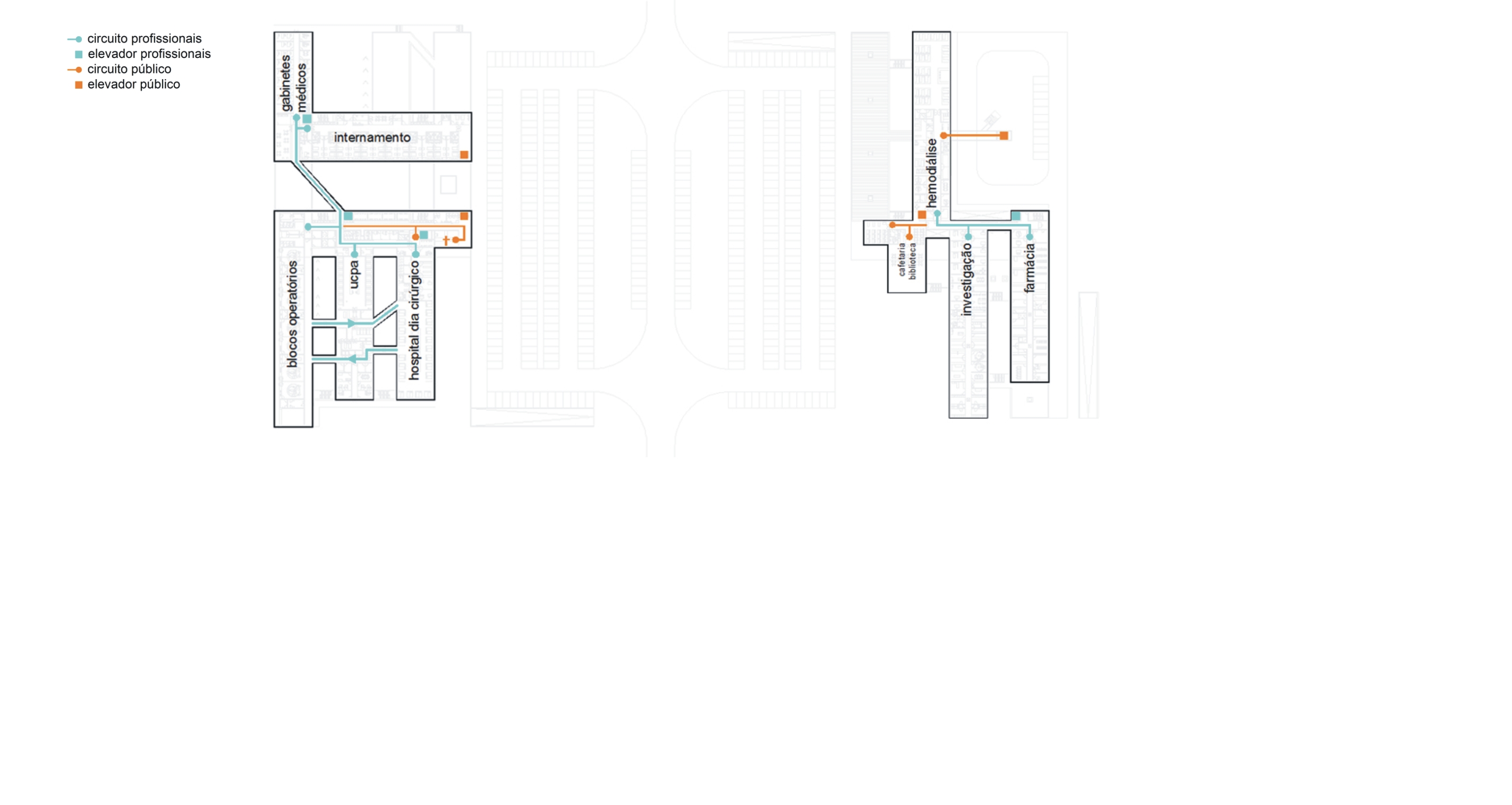 Porque a iluminação e conforto higrométrico são aspectos fundamentais para a consolidação desta ambição de aproximar a percepção do edifício ao lugar humanizado, a solução apresentada distribui os quartos de internamento na proporção de 88,89% a Sul, 4,94% a Poente, 3,70% a Nascente e apenas 2,47% a Norte. Propositada e conscientemente o organigrama funcional confunde-se com a solução arquitectónica. Foi objectivo máximo desenhar os circuitos mais evidentes, lineares – para os utentes –, funcionais e práticos – para os profissionais.